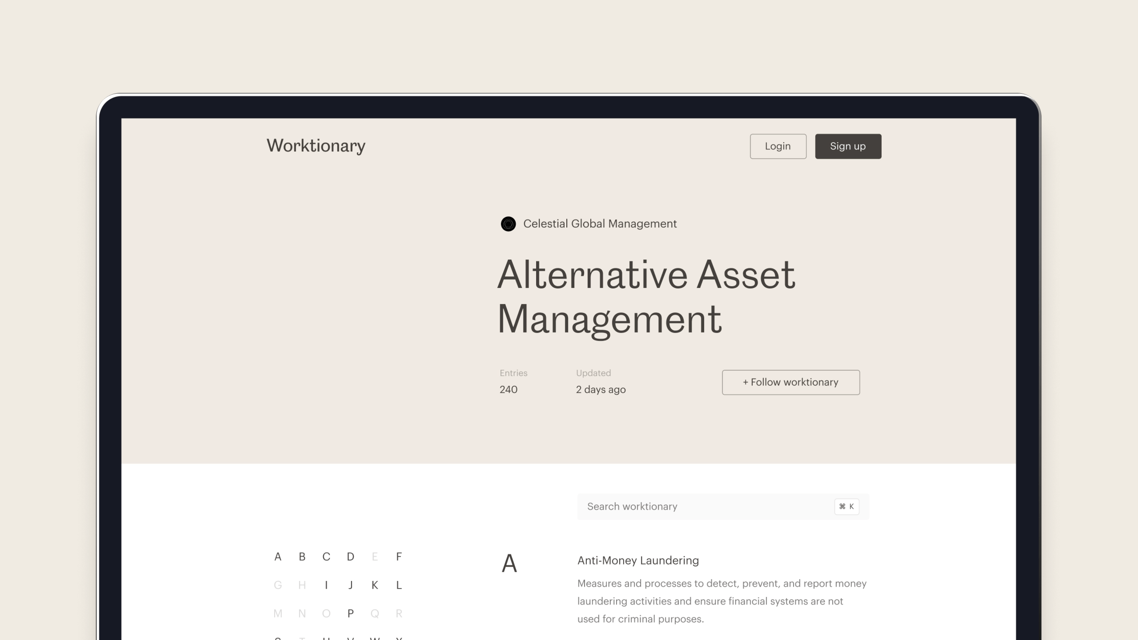 Helping companies get on the same page. Worktionary focuses on portablity of organisation's work terminology and the discoverability of others